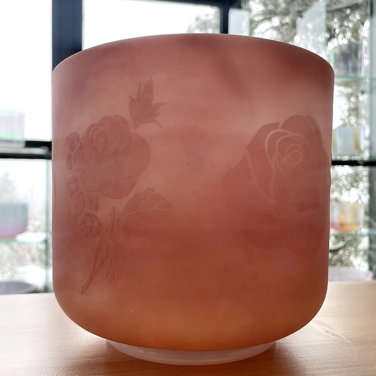 Rose Quartz W/ Etched Roses Frosted 7″ E -15 Crystal Tones® Singing Bowl